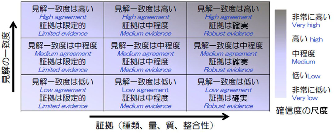 - IPCCでは確信度を証拠(evidence:種類、量、質、整合性)と見解の一致度(agreement)に基づき、VL(Very low:非常に低い)、L(Low:低い)、M(Medium:中程度)、H(High:高い)、VH(Very high:非常に高い)の5段階で総合的に評価しています。